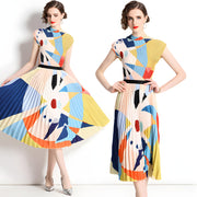 Abstract Pattern Miyaki Fold Blouse Pleated Skirt Two Piece Chiffon Set - 716400727184_BAS