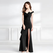 Black Satin Off-Shoulder Gown with Draped Bow and Asymmetrical Ruffle - 745673048813_BLA - S