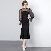Body-Fit Black Fish Tail Dress with Sheer Mesh Shoulders and Sleeves - 775301992220_BAS - S