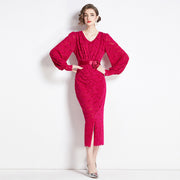 French Lace Long Sleeve V Neck Front Slit Body-fit Dress With Rose Belt - 750531237798_ROS - M