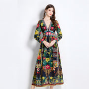 Printed Chiffon Plunging V - Neckline Elasticated Waist Front Split Long Dress - NRJ-720#2496 - M