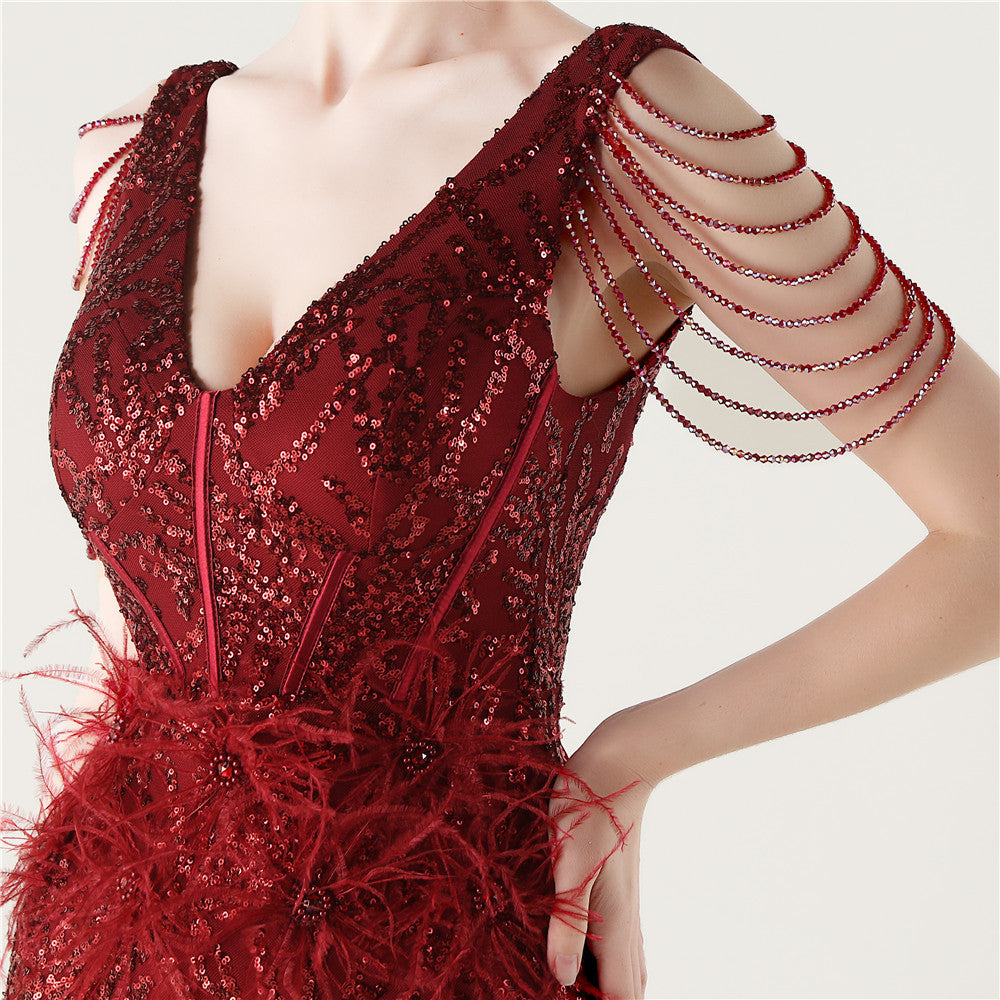 Sequin Slit Dress with Beaded Shoulder Fringe