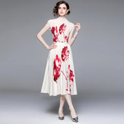 Floral Fusion Miyaki Fold Blouse Pleated Skirt Two Piece Chiffon Set - 707706878798_RED - M