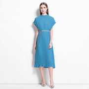 Blue Pure Elegance Pleated Pearl Belt Dress