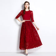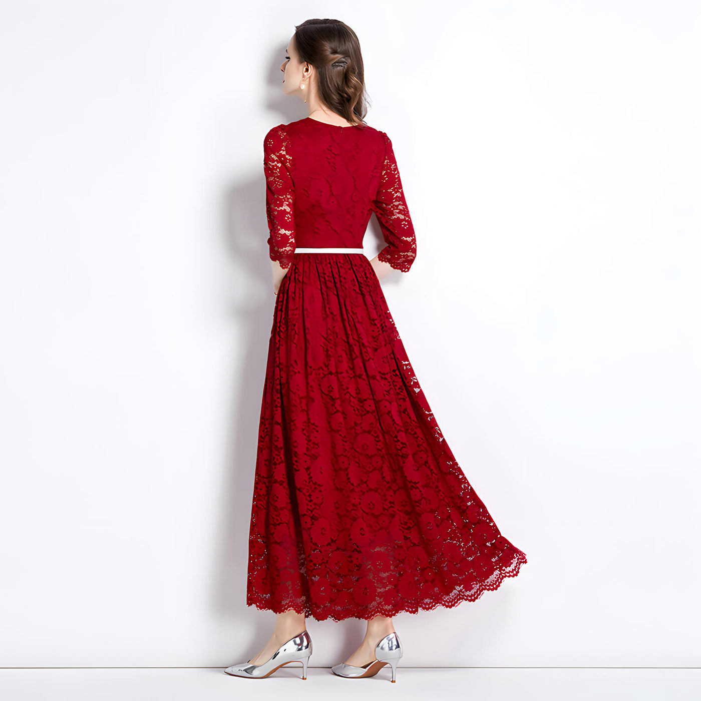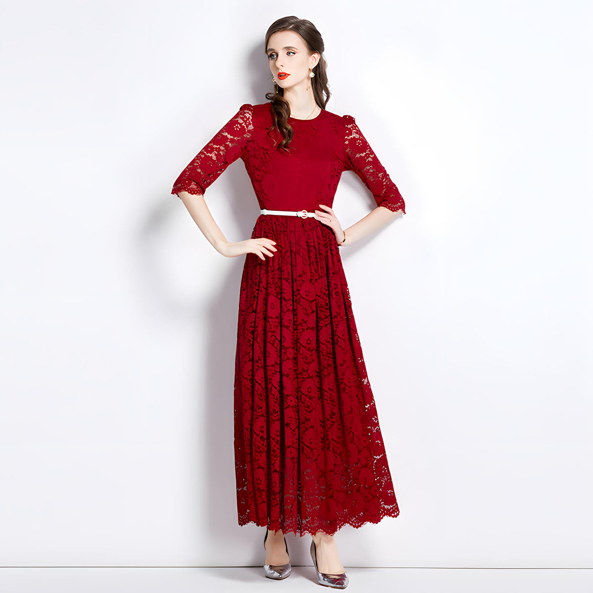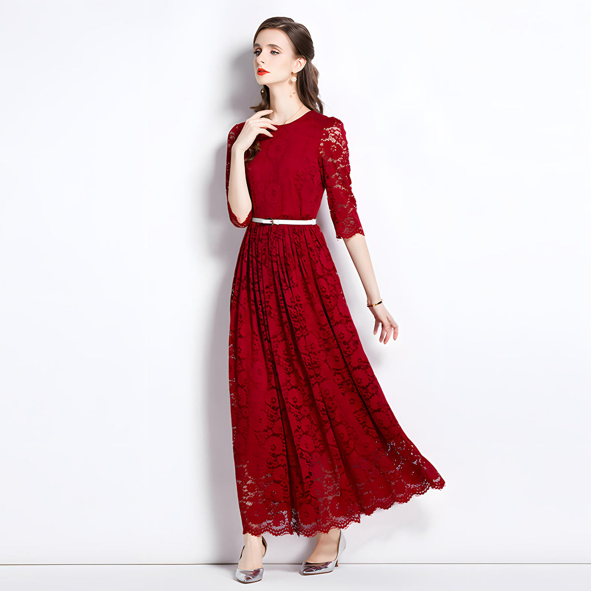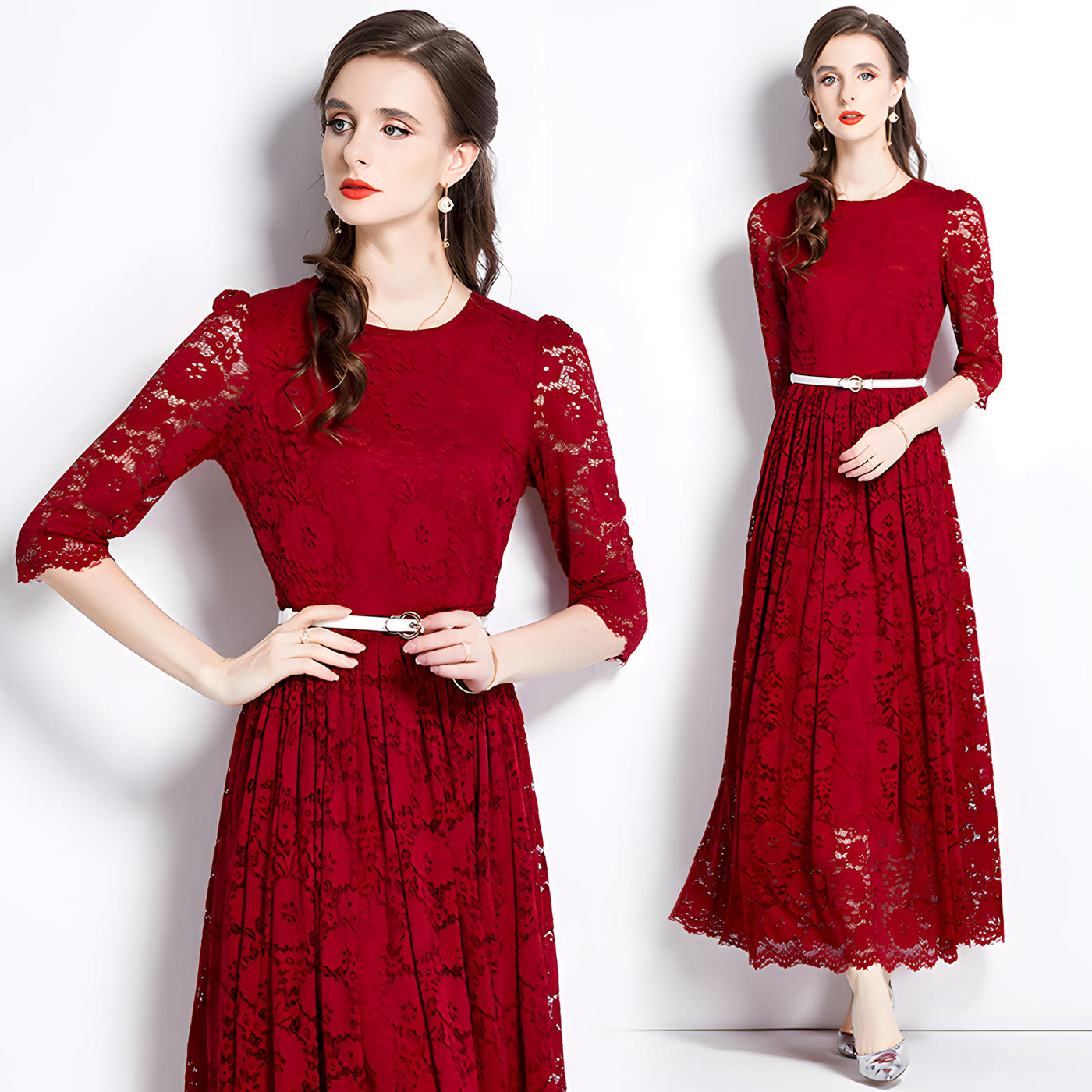 French Lace Long Sleeve Round Neck Long Dress With Belt - 745818611956 - M