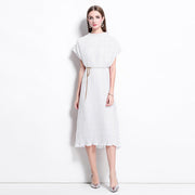 White Pure Elegance Pleated Pearl Belt Dress - M
