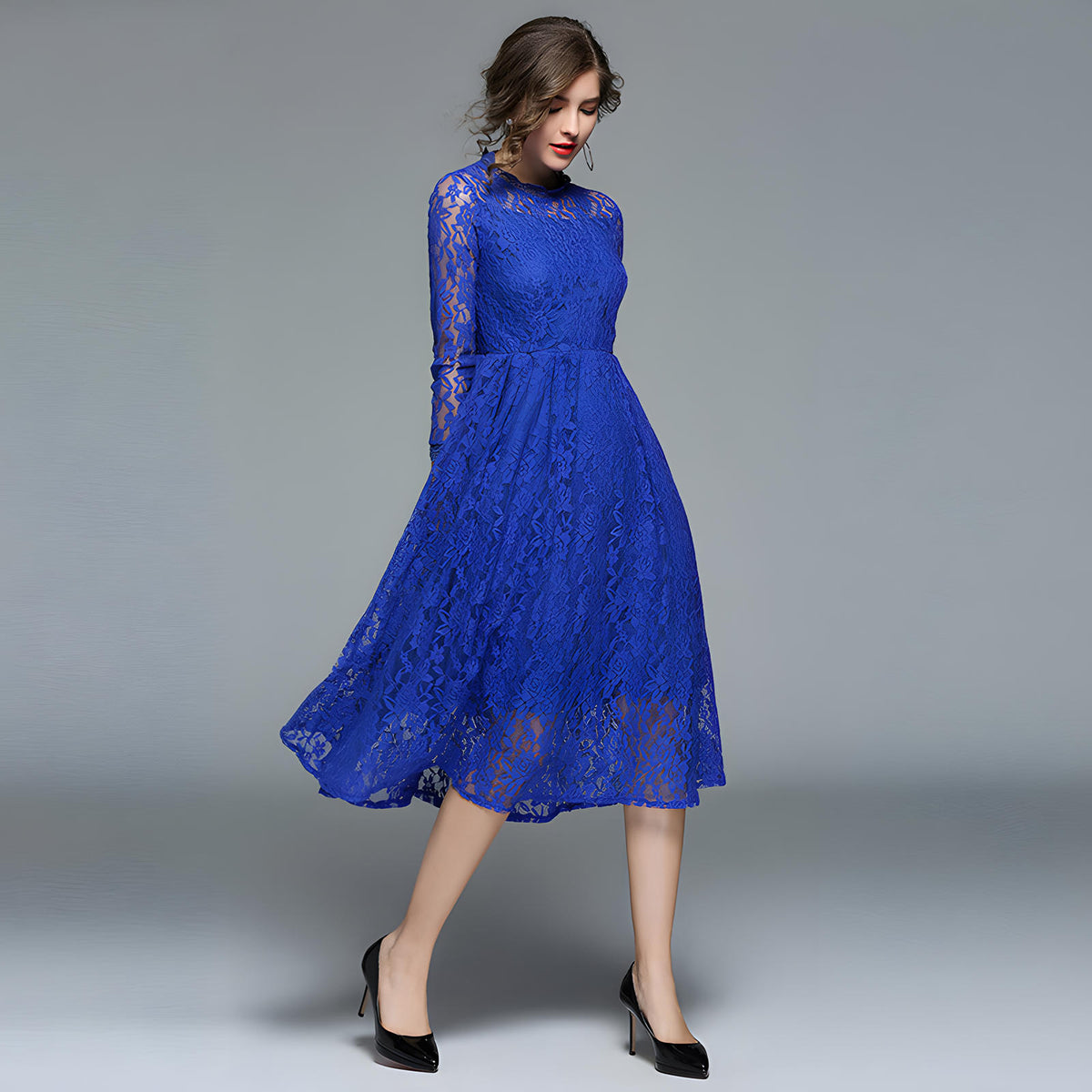 Luxury French Lace High Neck Retro Electric Blue Dress - 405#609 (EOSS)