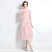 Embroidered French Lace Single Breasted Full Sleeve Blouse and Skirt Two Piece Set - 8566 #607_PINK - M