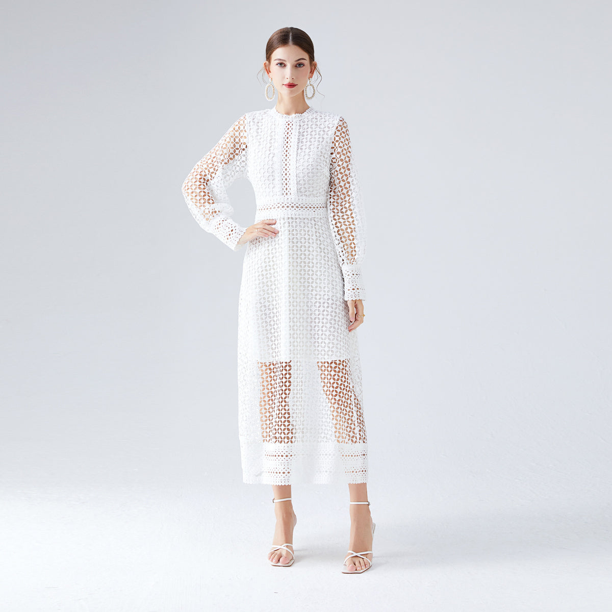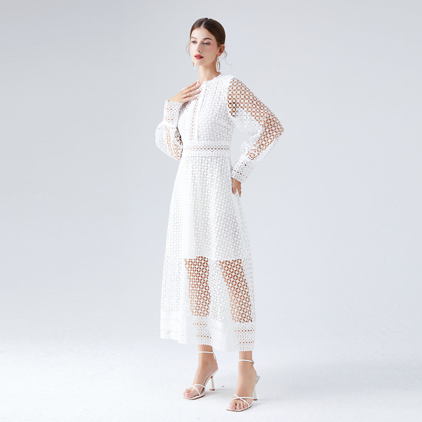 French Crochet Lace High Neck Lantern Sleeve White Dress - 735550461594_WHI - M