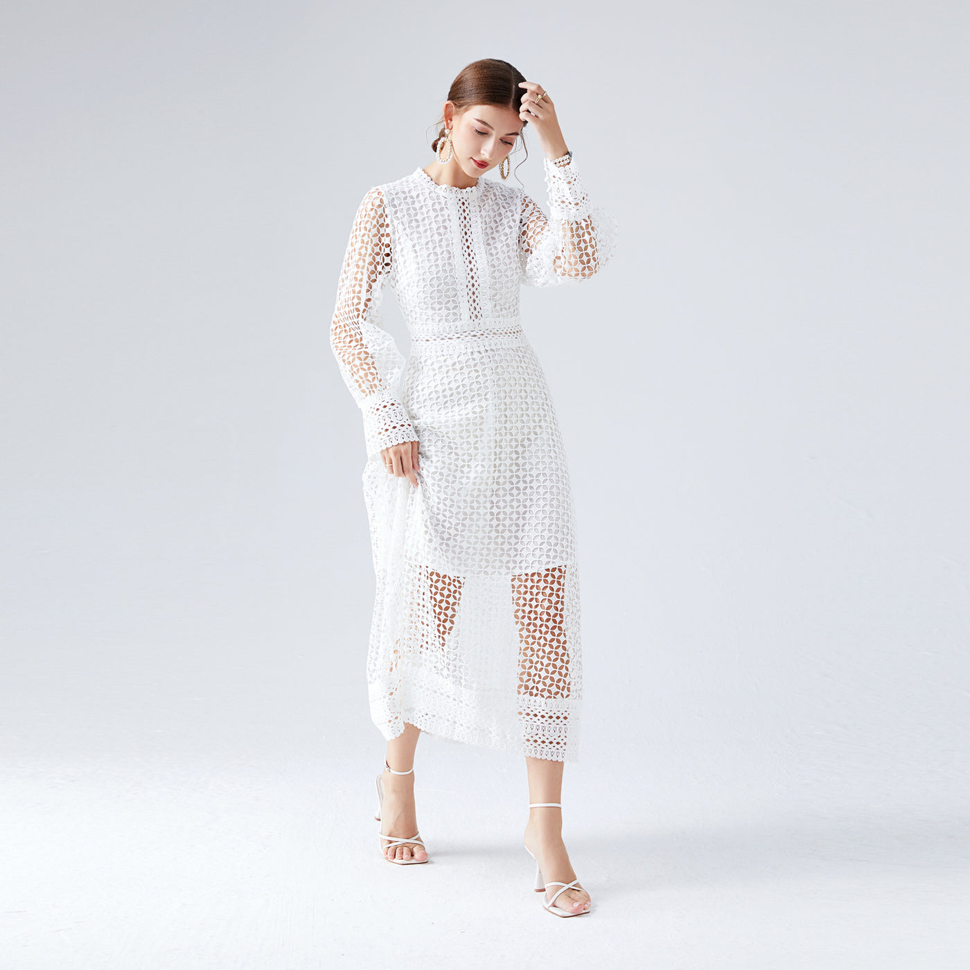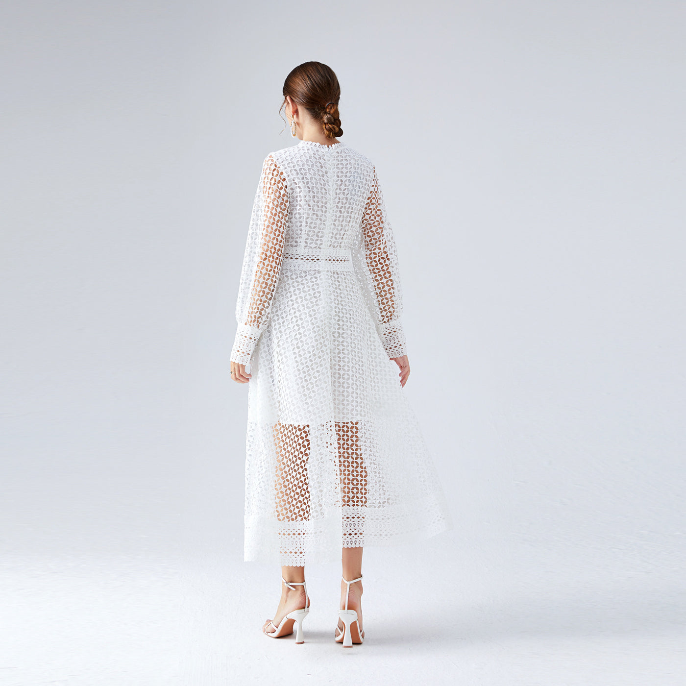 French Crochet Lace High Neck Lantern Sleeve White Dress - 735550461594_WHI