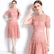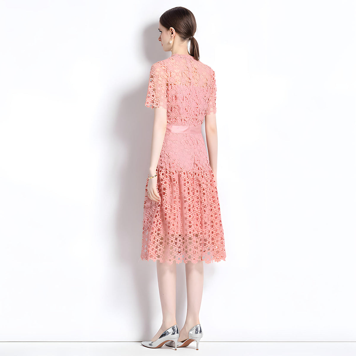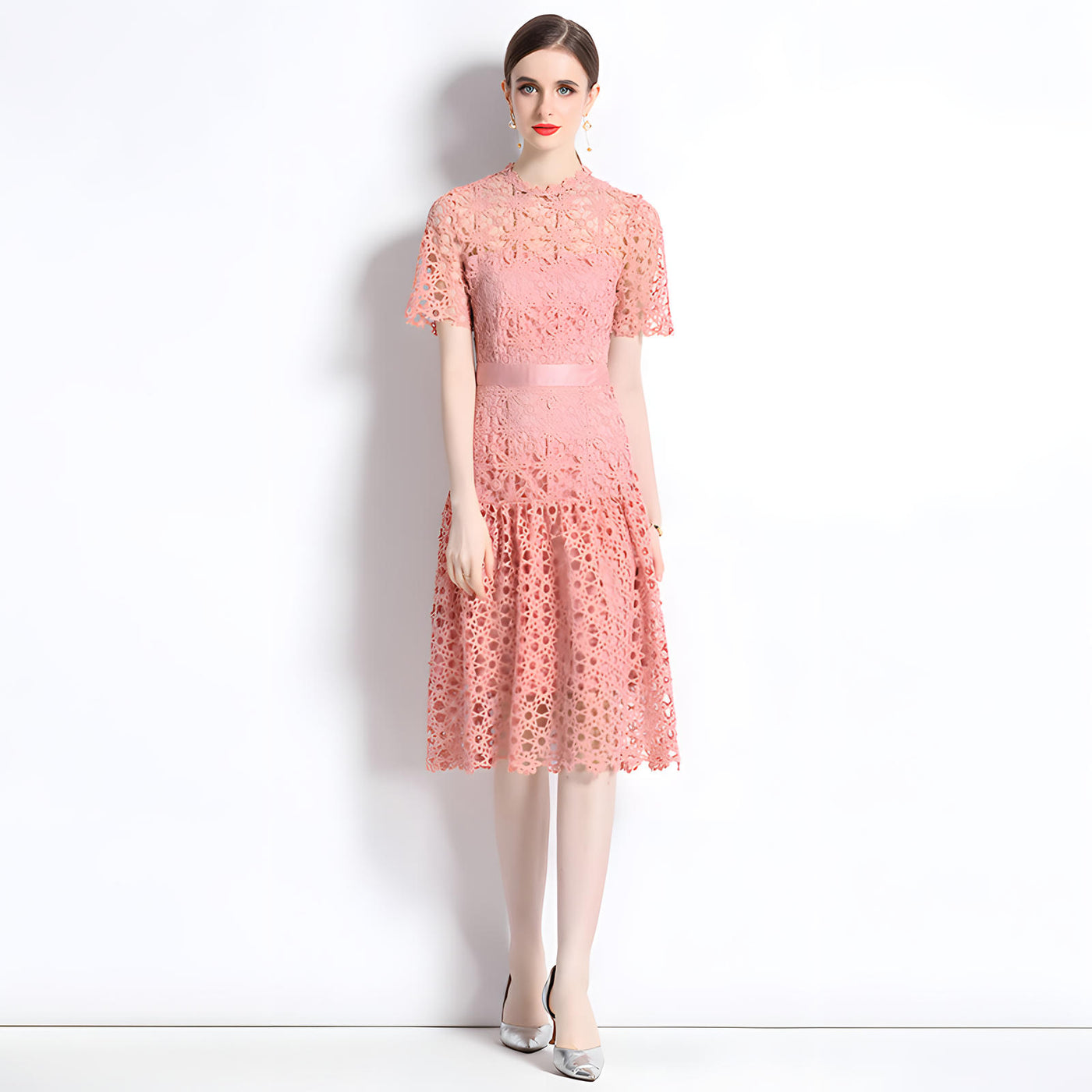 French Crocheted Lace Round Neck A - Line Peach Dress - 331#609