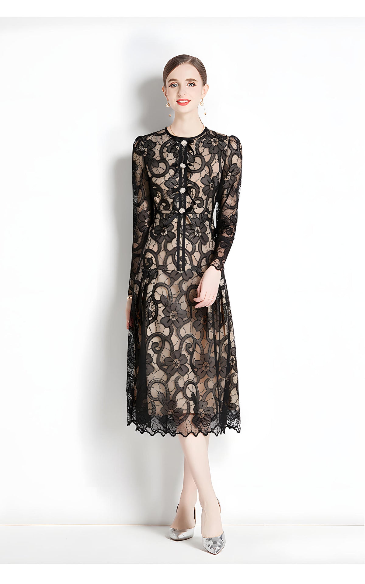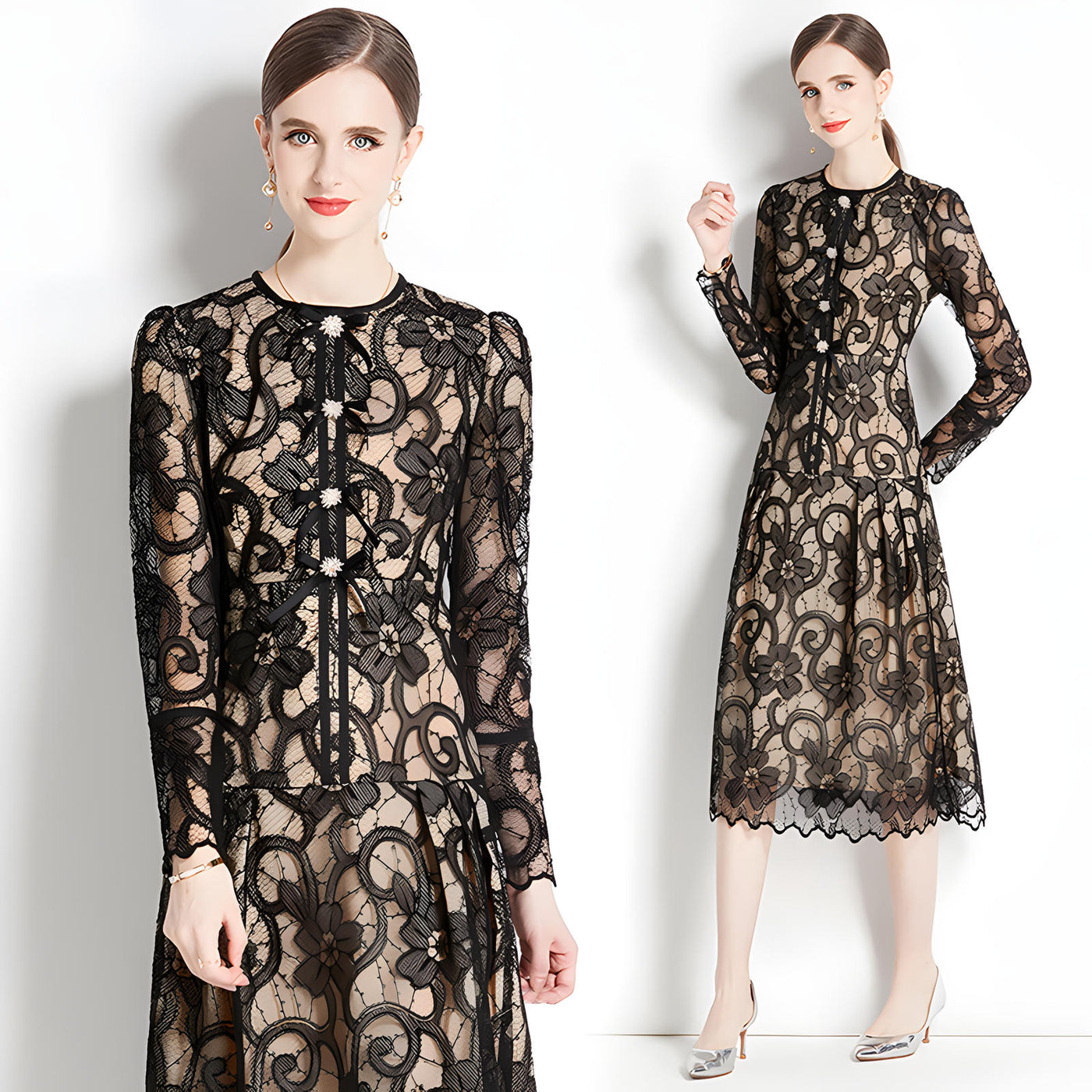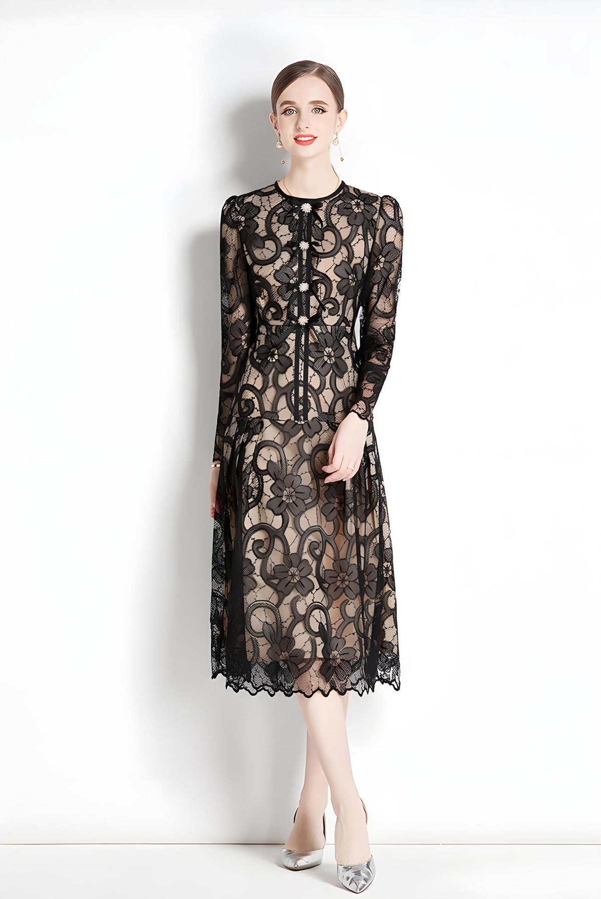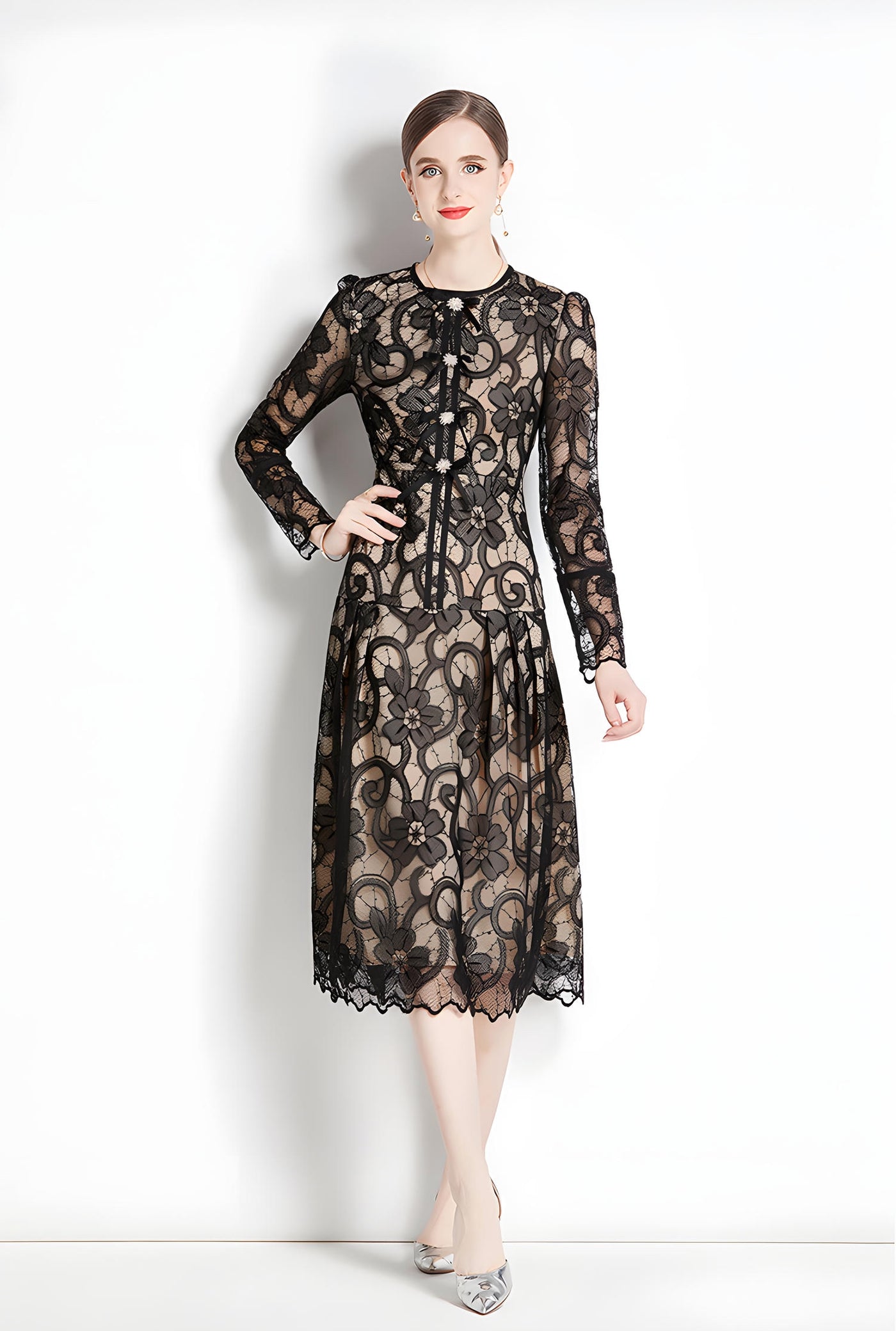 French Lace Front Bow Crew Neck Black And Nude Dress - 737166050267_BAS