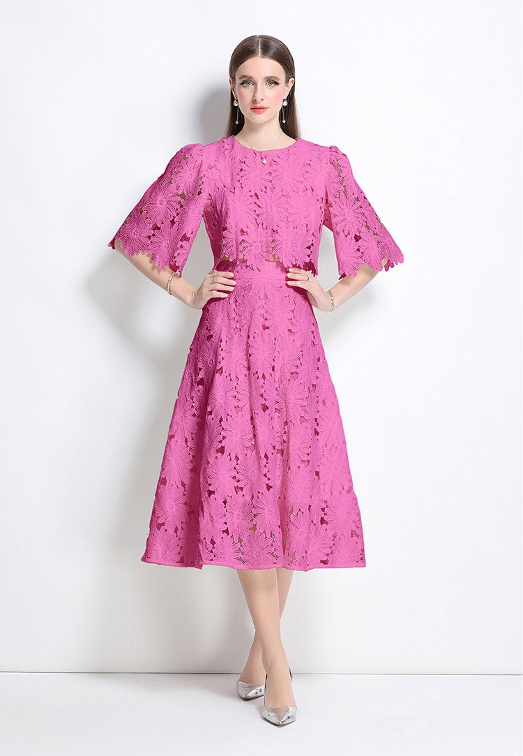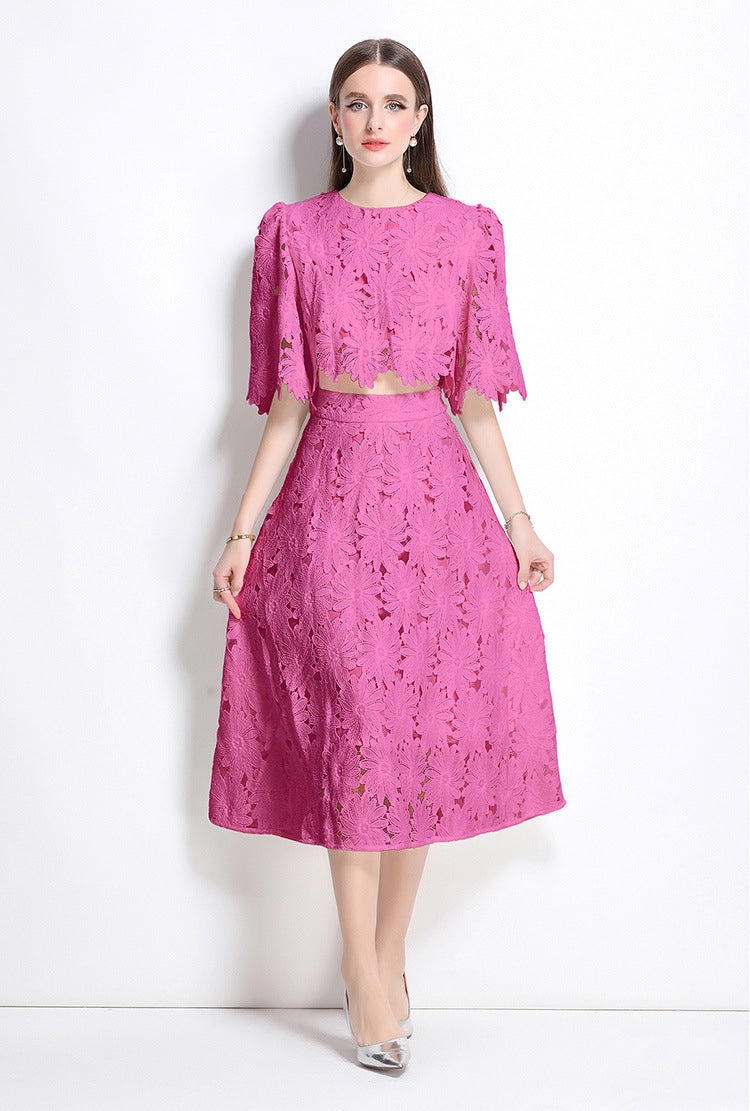 Fuchsia Floral Lace Two-Piece Midi Set - 906455894976_ROSERED