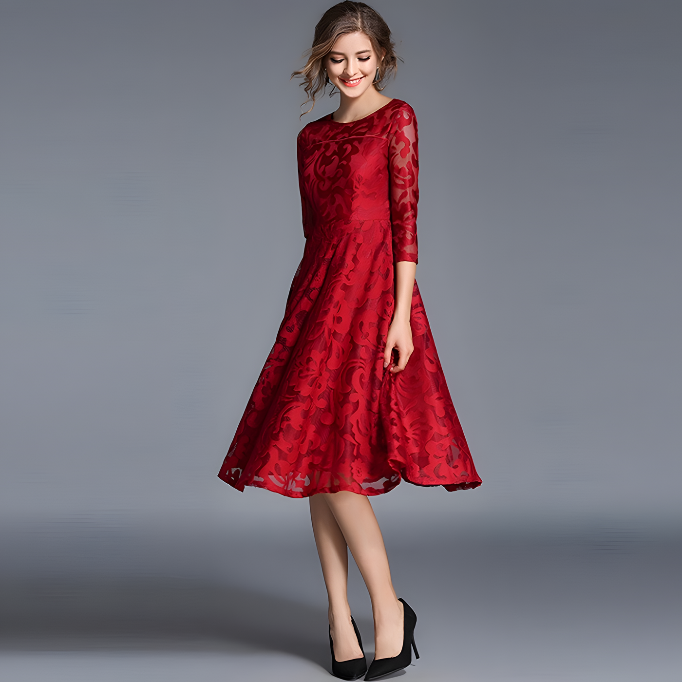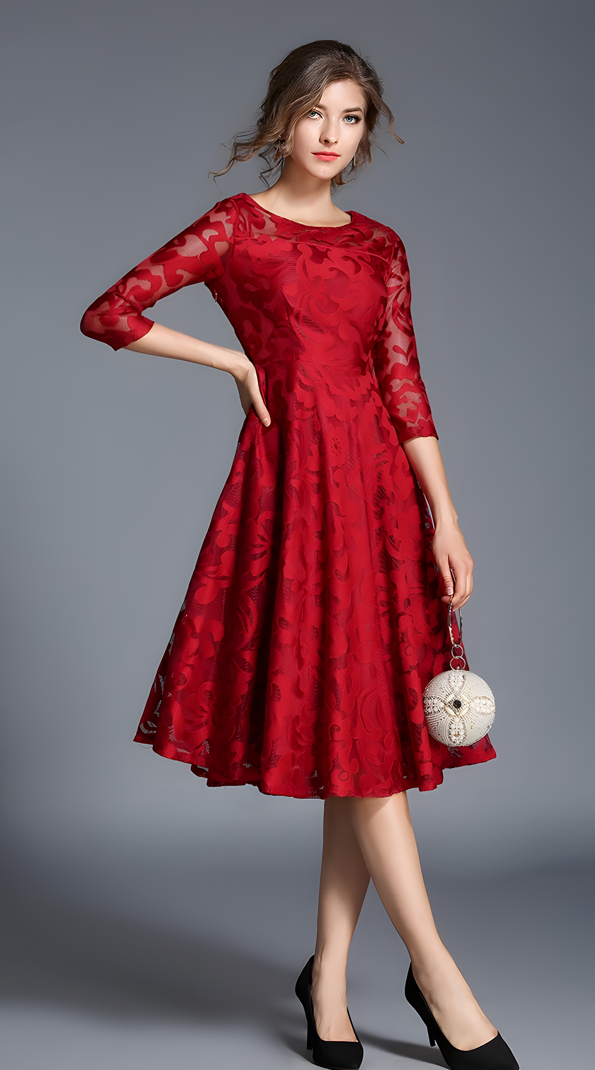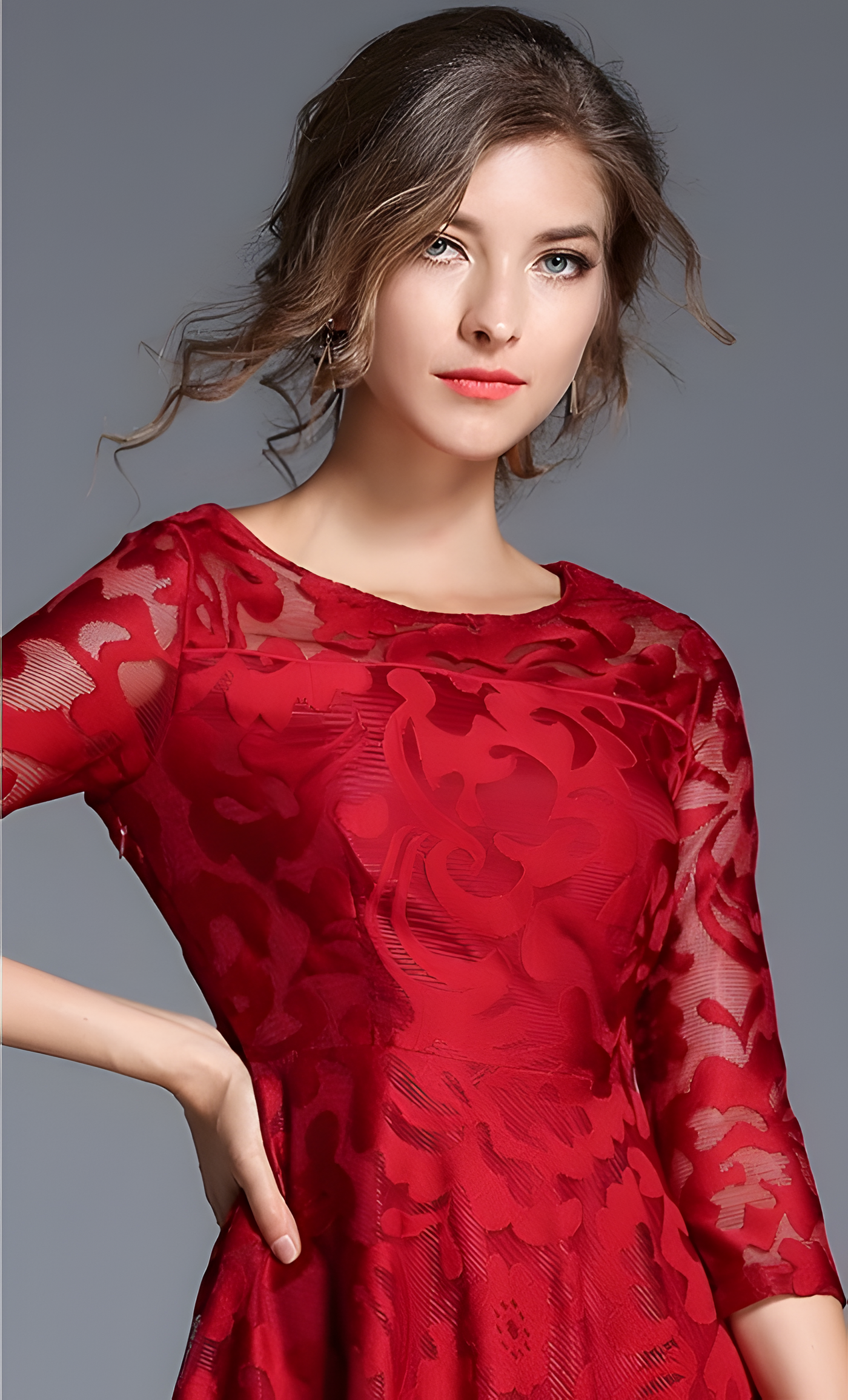 Lace Flocking Boat Neck Fitted Vest Large Hem Skirt Dress - 607715875502_CLARET