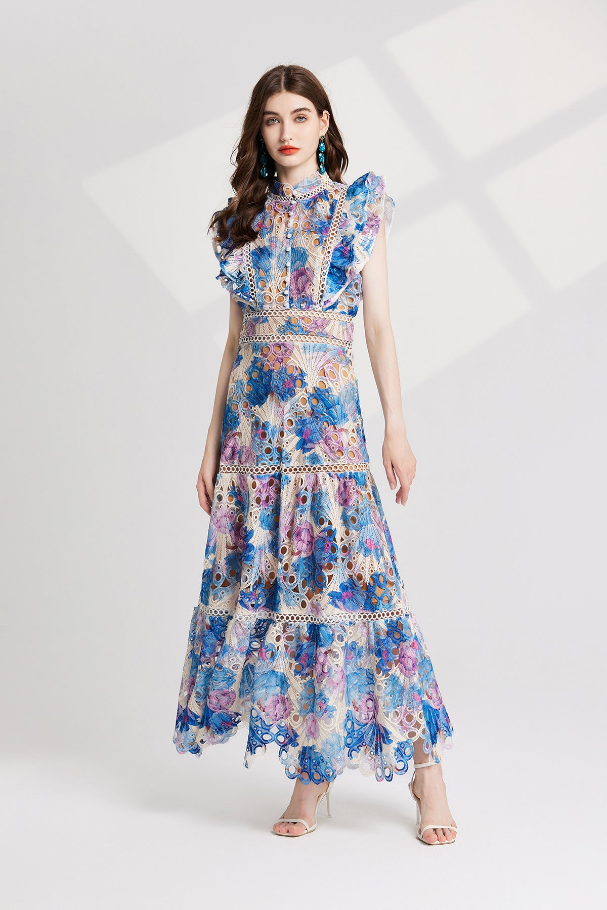 Luxury French Lace Blue Long Dress With Flutter Sleeve - 827491131616_BLU - M