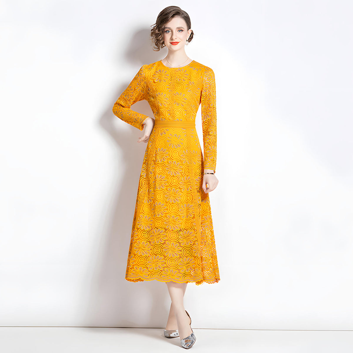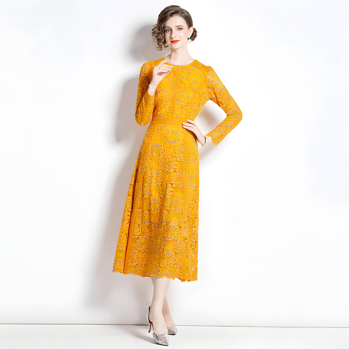 Luxury French Lace Full Sleeve Round Neck Long Dress - 6938#607_YELLOW
