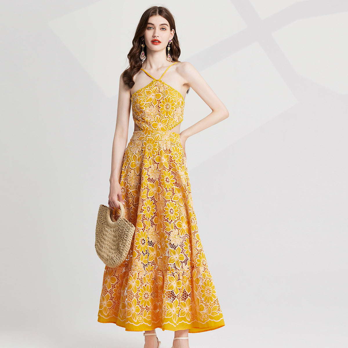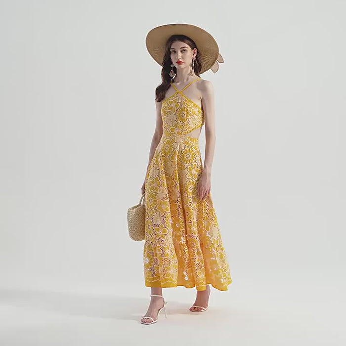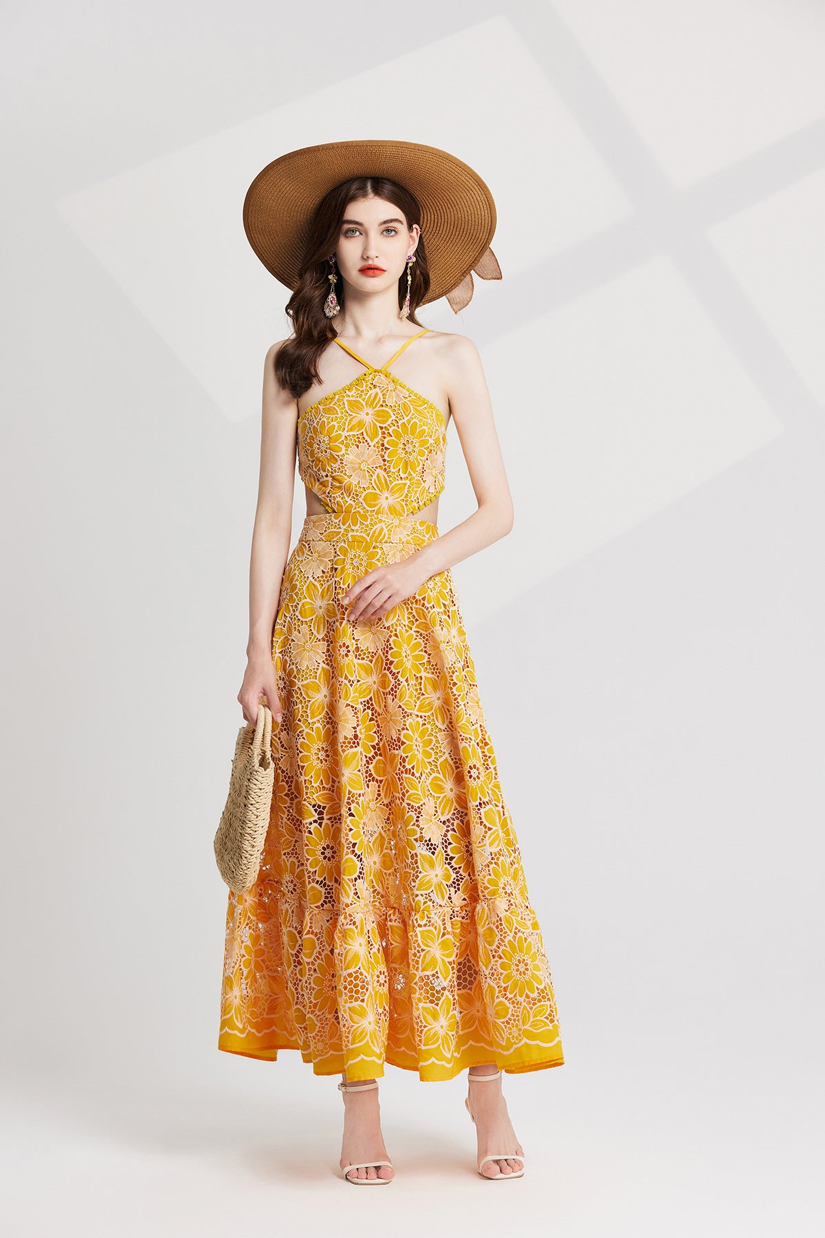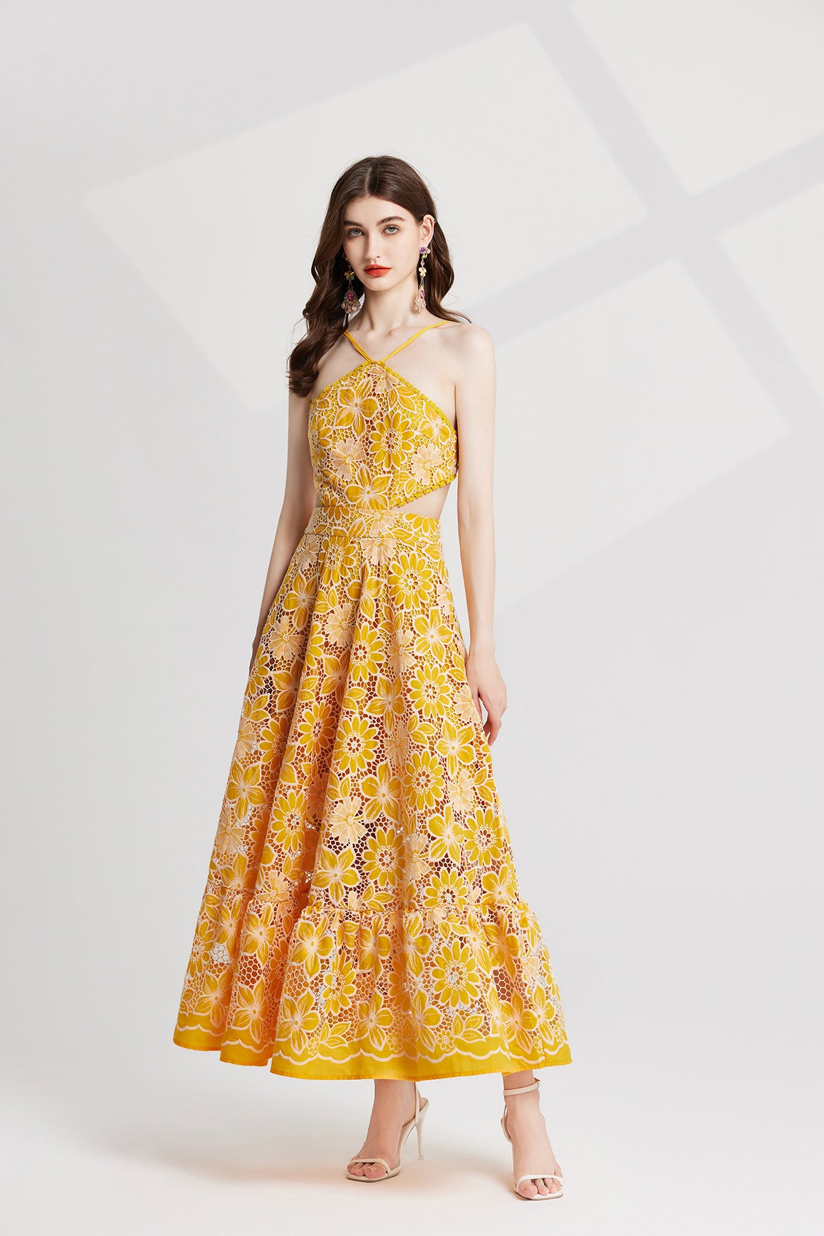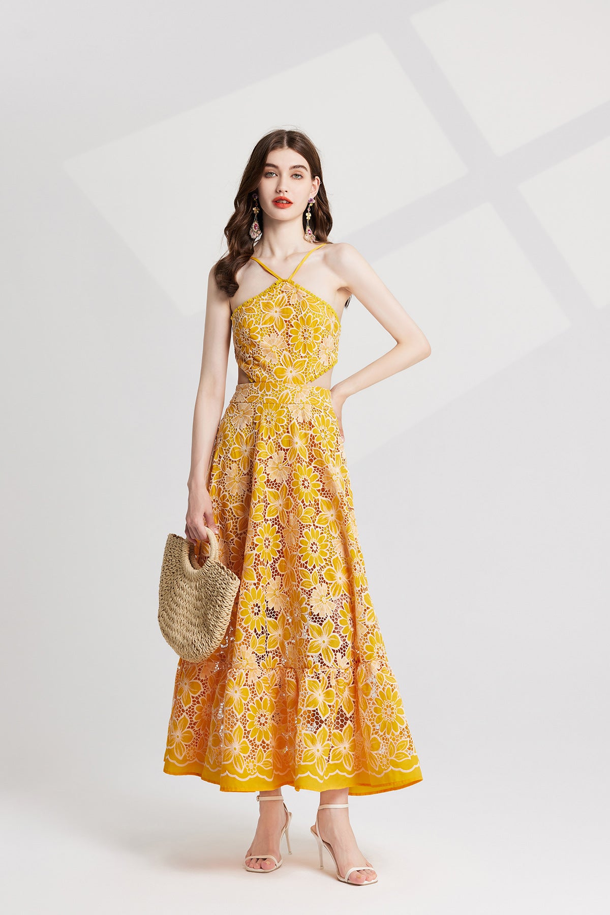 Luxury French Lace Halter Neck Holiday Breeze Black Dress - 829851111269_YEL - M