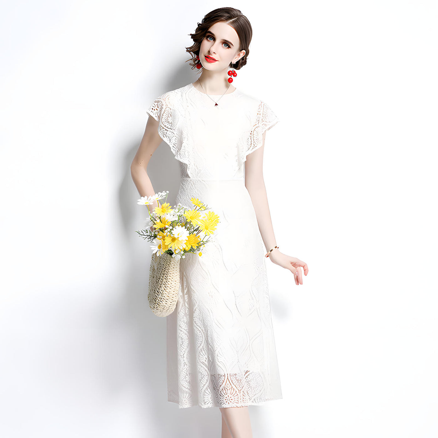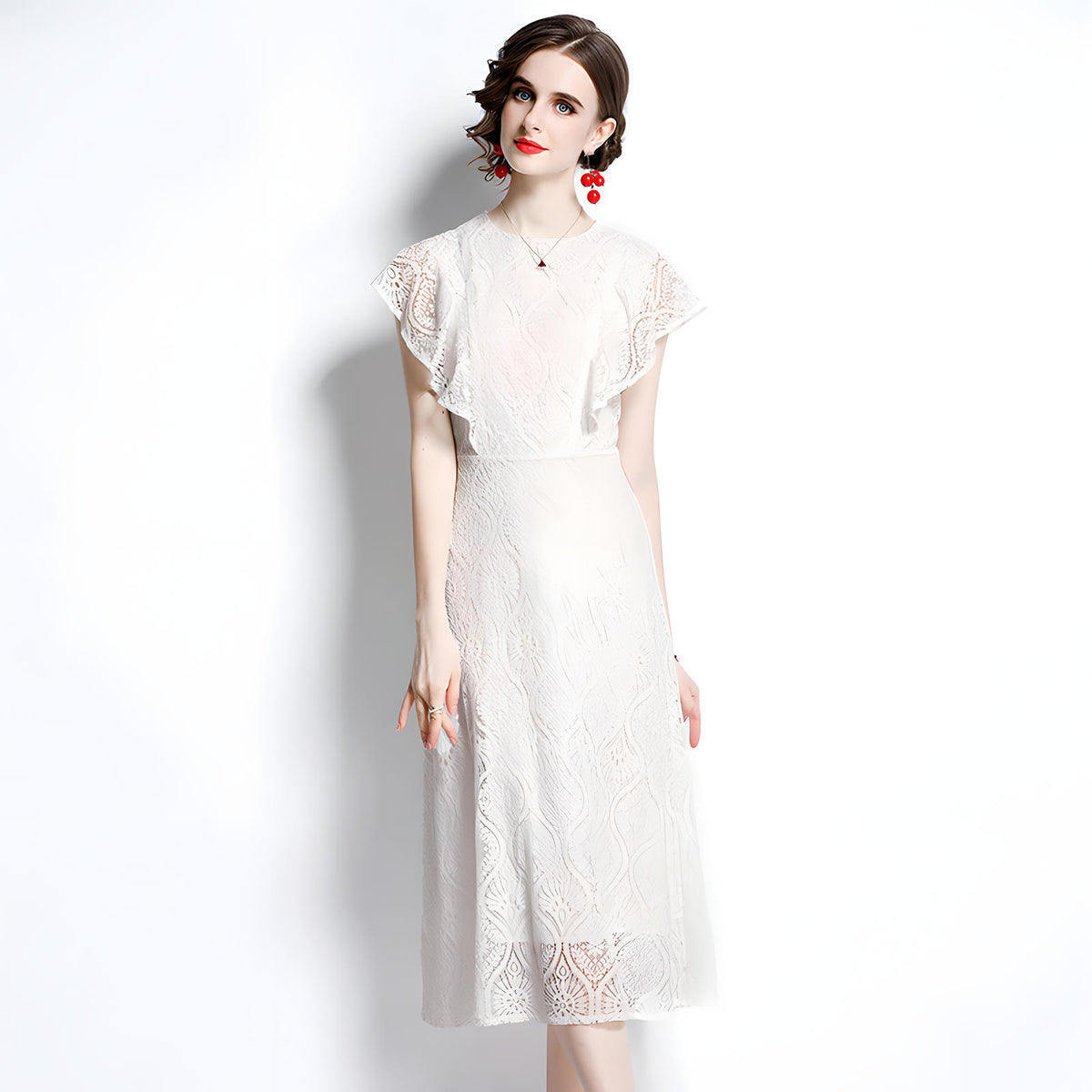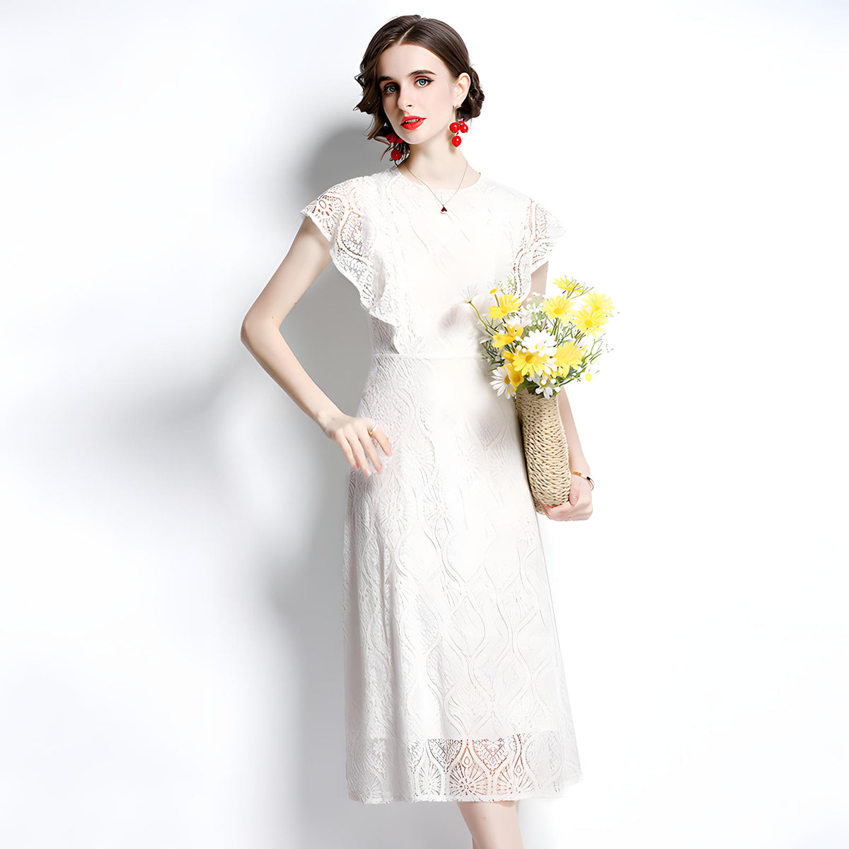 Round Neck Ruffled Sleeve French Lace White Dress - 647396106470_BAS - M
