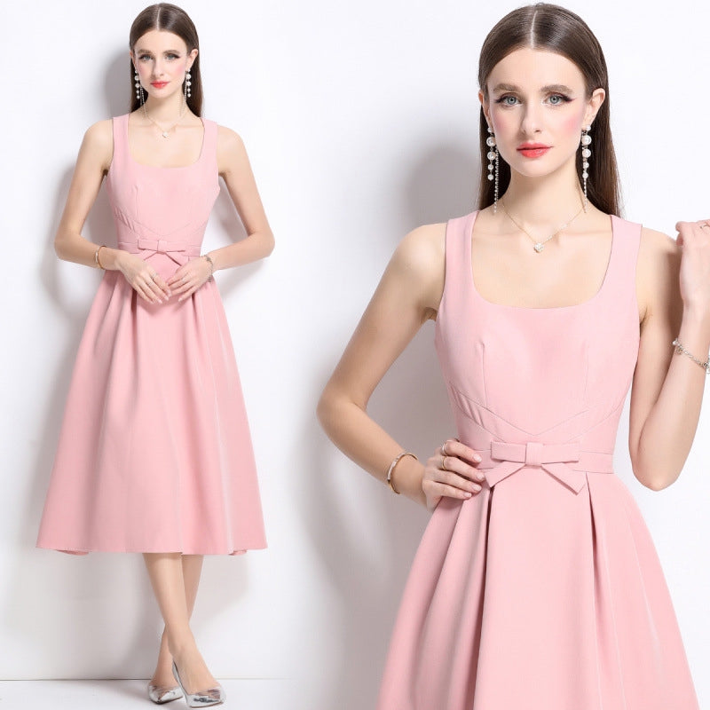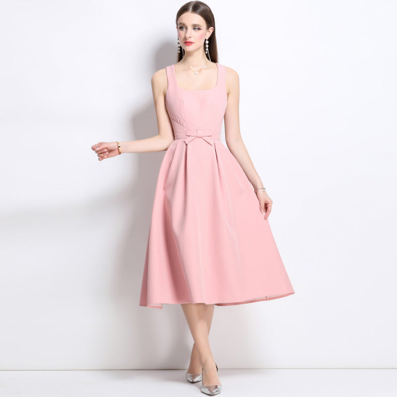 Elegant Rose Midi Bow Dress - 901083289296_PINK - M