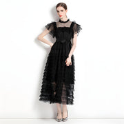 High Neck Polka Dot Mesh Multitier Skirt Elasticated Waist Butterfly Sleeve Black Dress With Satin Belt - 716644450507_BAS