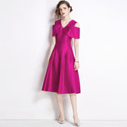 Off Shoulder V - Neck Fitted Vest Tucked Pleats Skirt Hot Pink Solid Satin Dress - NRJ-701A#1645_2 - M