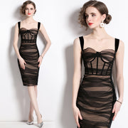 Corset Vest Nude Lining Mesh And Velvet Suspender Fitted Black Short Dress - 709210134752_BAS - M