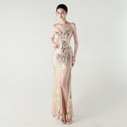 Sequin Shoulder Cascade Open-Shoulder Gown