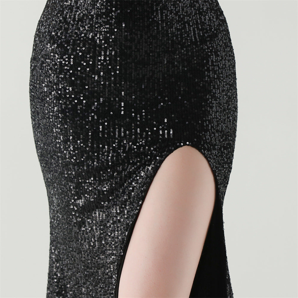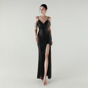 Black Sequin Fringe Sleeve Slit Evening Gown