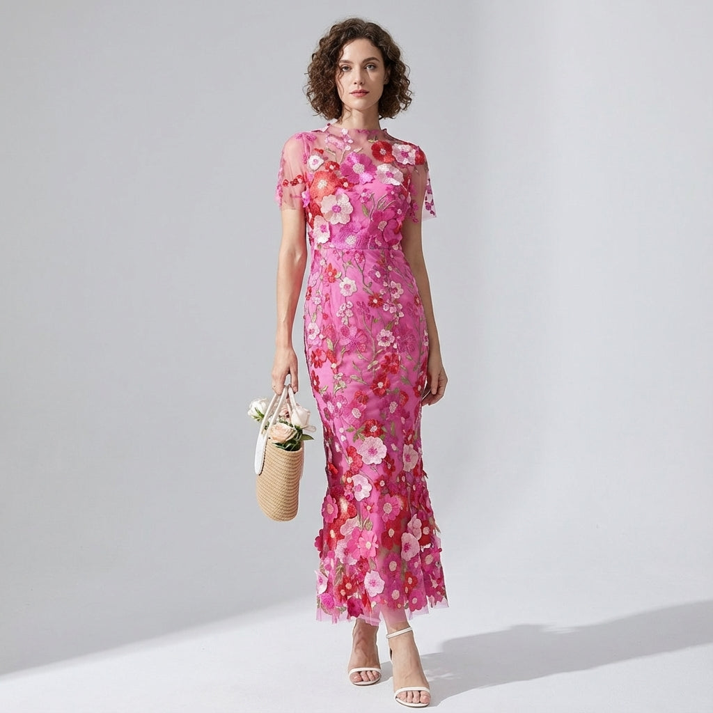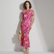 Intricate Floral Embroidery Mesh Fishtail Rose Red Dress - 810908122798_ROS - M
