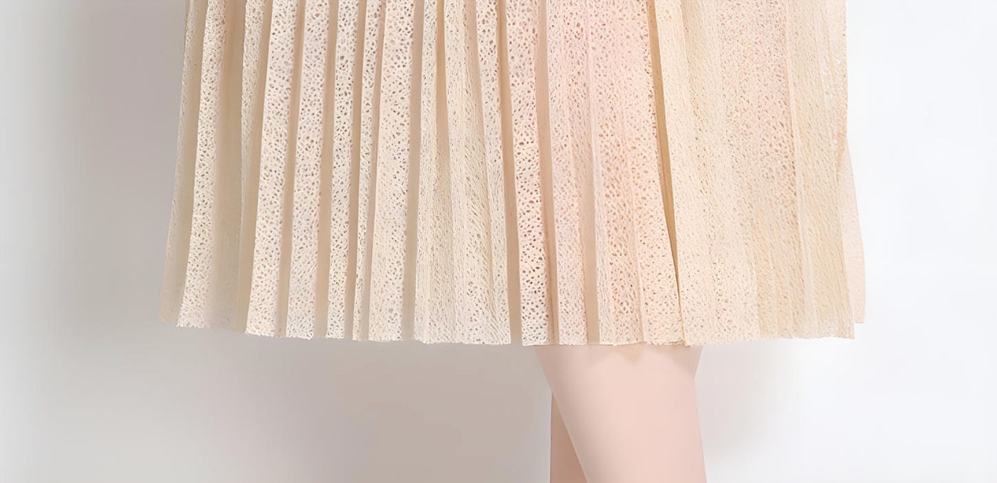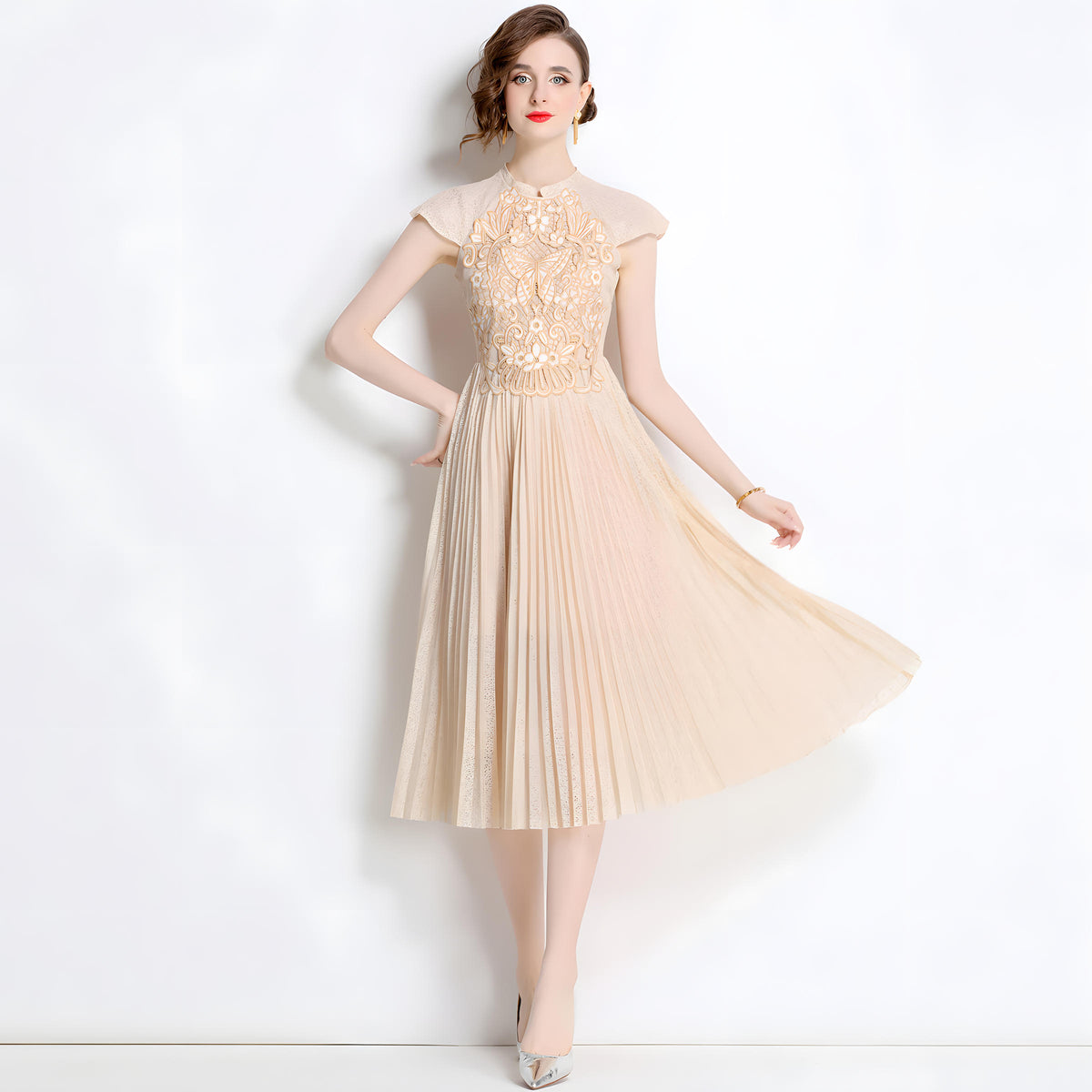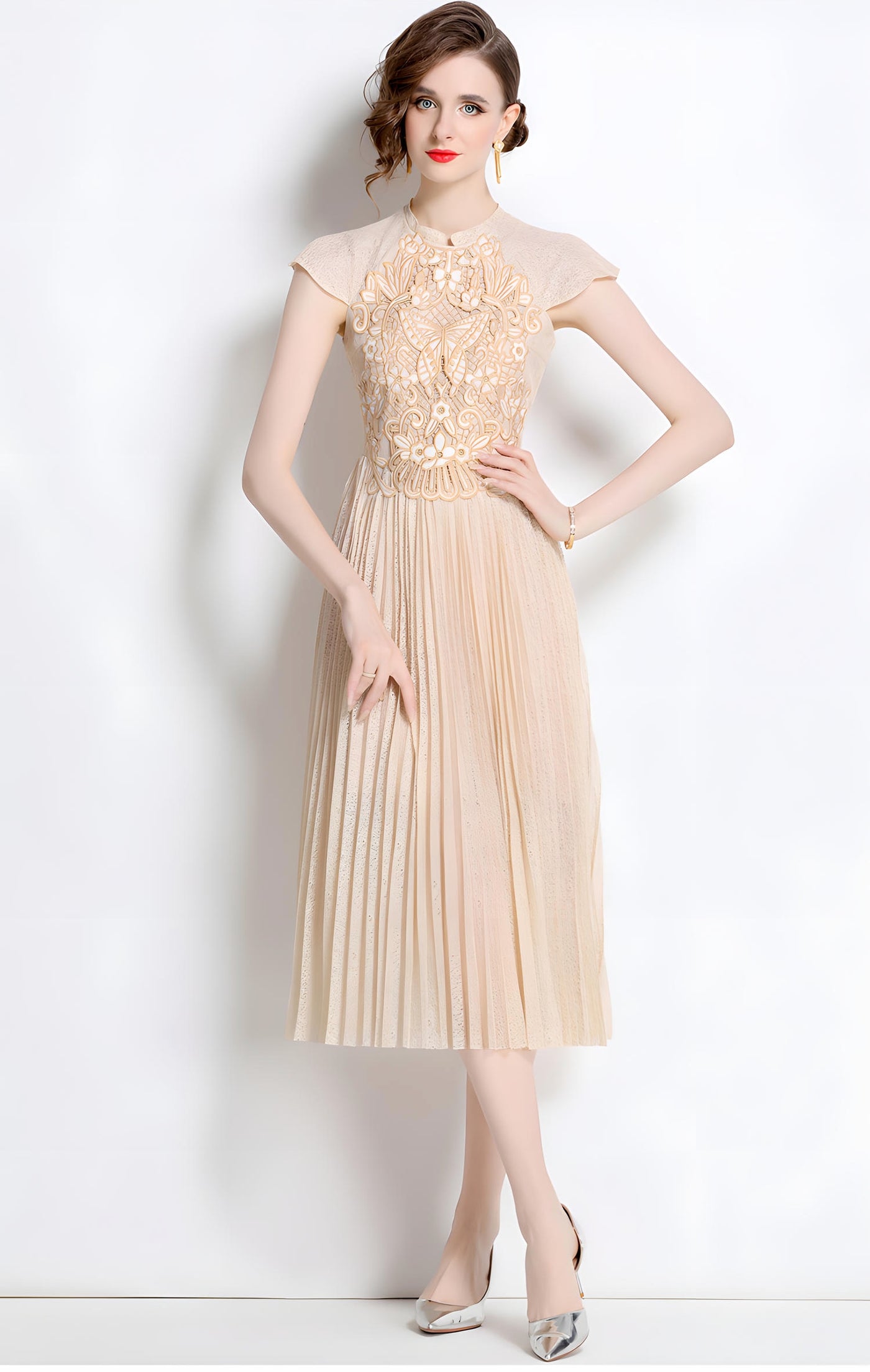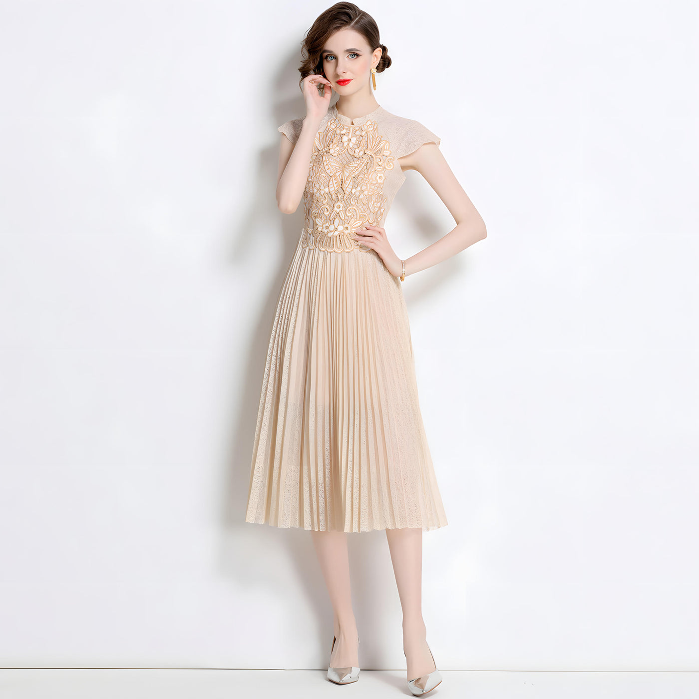 Luxury French Embroidered Patch Vest Dress with Cap Sleeves and Pleated Skirt - 801101210081_BAS - M